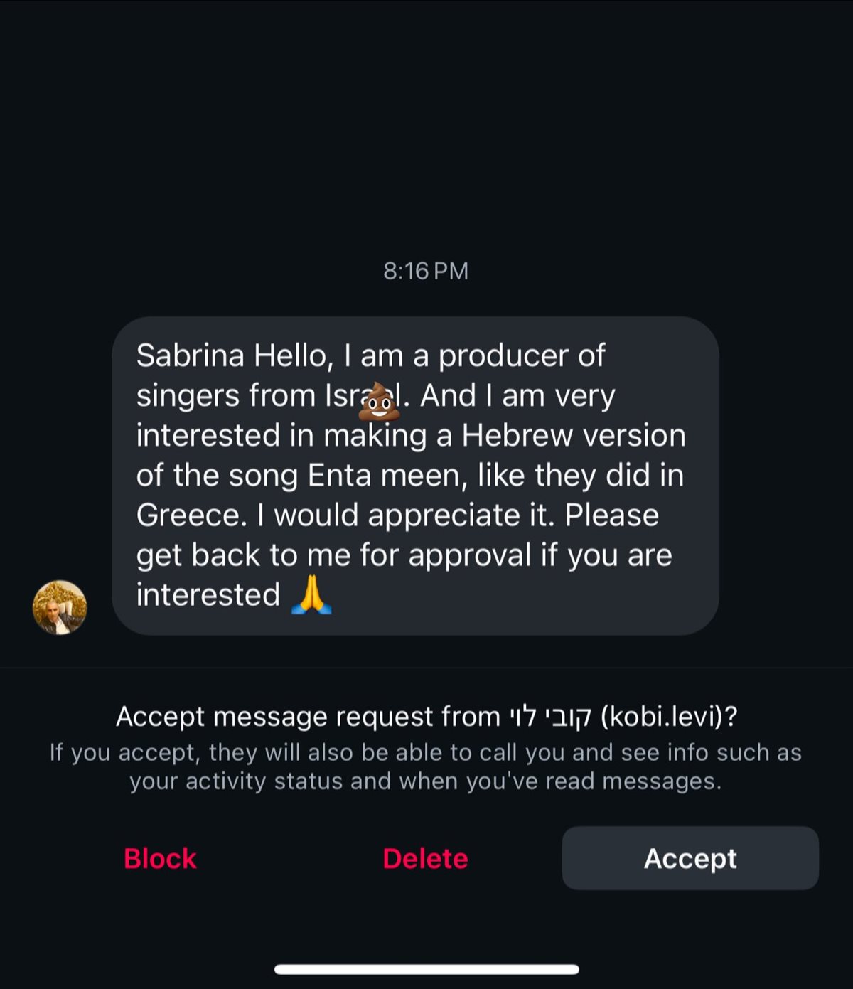نشرت صابرين النجيلي نص الرسالة التي تتضمن العرض الإسرائيلي، والتي أُرسلت لها عبر موقع تبادل الصور والفيديوهات “انستجرام”، وأرفقتها بتعليق قائلة: “عفواً .. أنت بالنسبة لي مش موجود ولا بلدك موجودة .. وربنا الغنى والرازق بعيد عن أي استفادة مادية لو منكم مش عيزاها”.