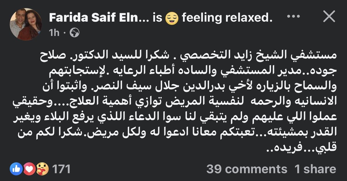 وكتبت فريدة سيف النصر: “مستشفي الشيخ زايد التخصصي . شكرا للسيد الدكتور. صلاح جوده.. مدير المستشفي والساده أطباء الرعايه .لإستجابتهم والسماح بالزياره لأخي بدرالدين جلال سيف النصر”.