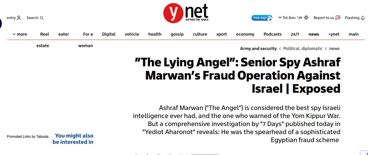 وكشفت صحيفة يديعوت أحرونوت الإسرائيلية النقاب عن أحدث تحقيق تناول حقيقة أشرف مروان "الملاك الكاذب" الذي حوّل أسطورة المُخابرات الإسرائيلية إلى نكتة هزلية بكل ما تعنيه الكلمة.