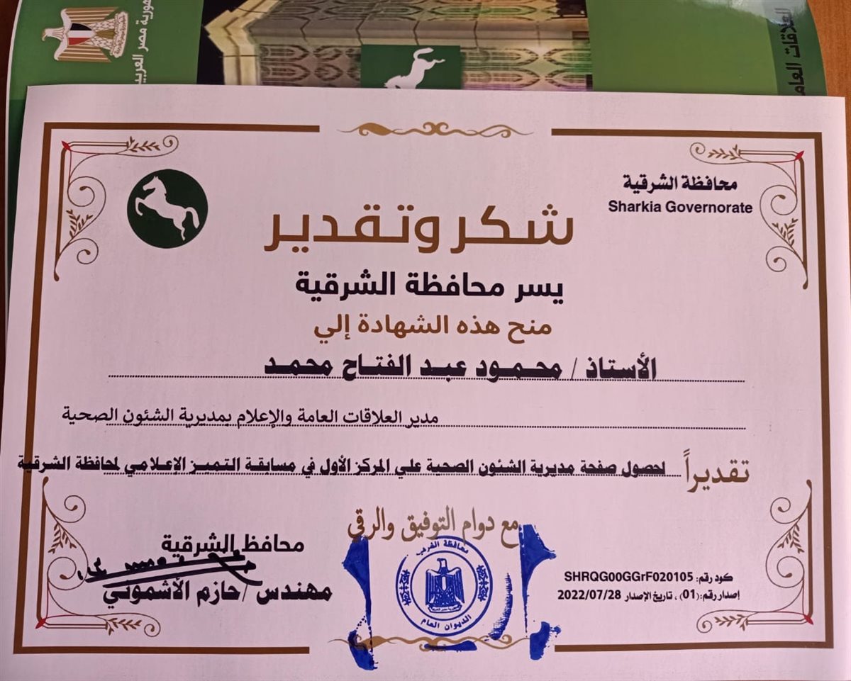 كرم المهندس حازم الأشموني محافظ الشرقية، الدكتور أحمد البيلي وكيل وزارة الصحة بالشرقية، ومحمود عبدالفتاح مدير إدارة العلاقات العامة والإعلام والمكتب الإعلامي بمديرية الشئون الصحية بالشرقية، وذلك بعد حصول صحة الشرقية على المركز الأول على مستوى المحافظة في مسابقة التميز الإعلامي في نسختها الأولى، كأفضل مؤسسة حكومية إعلاميًا، والتي أطلقتها محافظة الشرقية كأول مسابقة من نوعها على مستوى محافظات الجمهورية والمؤسسات الحكومية، بهدف تعزيز ونشر ثقافة التميز والإبداع وخلق جيل جديد من الكوادر الإعلامية، قادرة على تقديم رسالة إعلامية متميزة وهادفة تخدم المواطنين بالمحافظة، مع تحفيز مسئولي ومنسقي الإعلام بالمراكز والمدن والأحياء والمديريات الخدمية والهيئات الحكومية الأكفاء بالمحافظة.