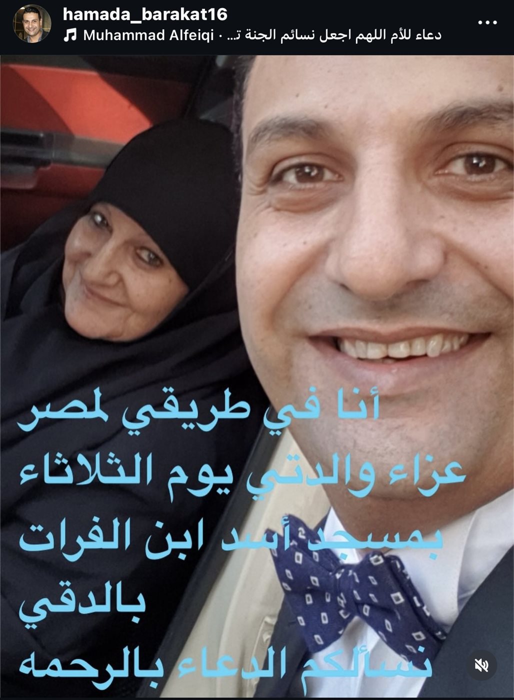 نشر حماده بركات صورته مع والدته وأرفقها بتعليق قائلًا: “أنا في طريقي لمصر.. عزاء والدتي يوم الثلاثاء بمسجد ابن الفرات بالدقي .. نسألكم الدعاء بالرحمة”.