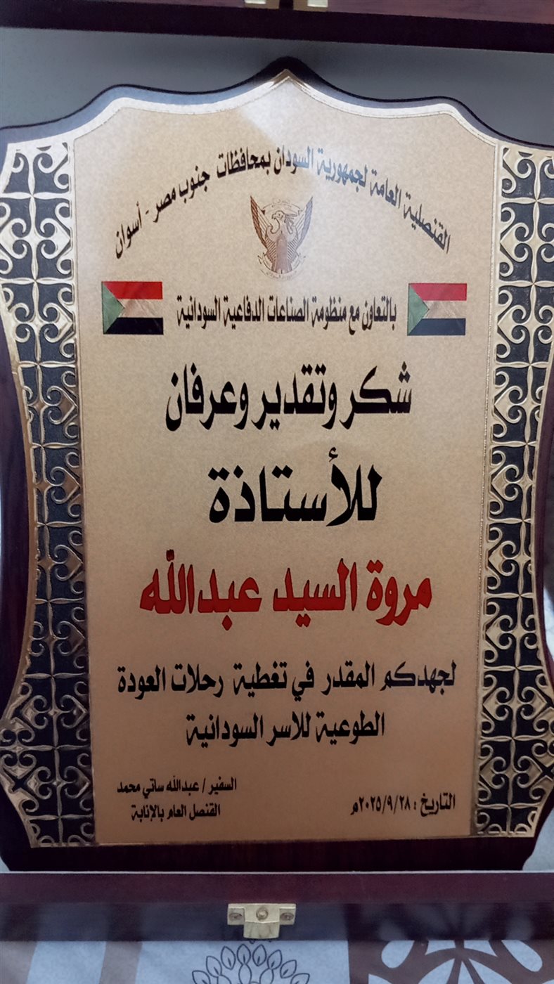كرم السفير عبدالقادر عبدالله قنصل دولة السودان الشقيقة مراسل موقع الوفد باسوان بمؤتمر صحفي خاص بالصحفيين المصريين والسودانيين، وبعد انتهاء المؤتمر تم تكريم الصحفيين بدروع، تعبير عن شكرهم للمتابعة التغطية للعودة الطوعية للأشقاء السودانيين العائدين إلى بلادهم الحبيب.