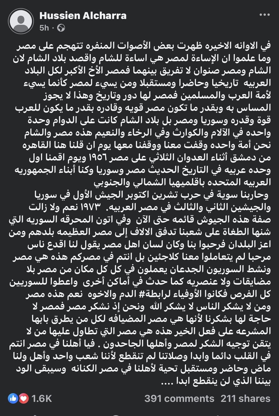 وكتب حسين الشرع: “في الآونة الأخيرة ظهرت بعض الأصوات المنفره تتهجم على مصر وما علموا ان الإساءة لمصر هي اساءة للشام واقصد بلاد الشام لان الشام ومصر صنوان لا تفريق بينهما فمصر الأخ الأكبر لكل البلاد العربيه  تاريخيا وحاضرا ومستقبلا ومن يسيء لمصر كأنما يسيء لأمة العرب والمسلمين”.