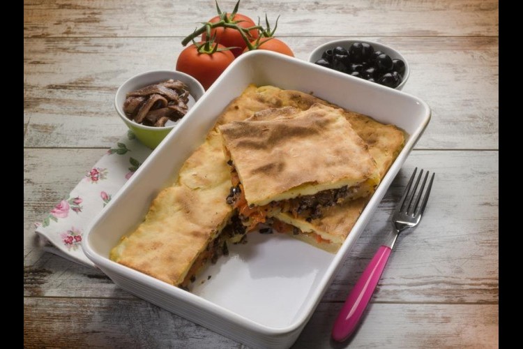 استمري في وضع طبقات العجين المدهونة بالزيت وتوزيع حشوة اللحم بالتناوب، مع الانتهاء بطبقتين أو ثلاث طبقات من العجين.