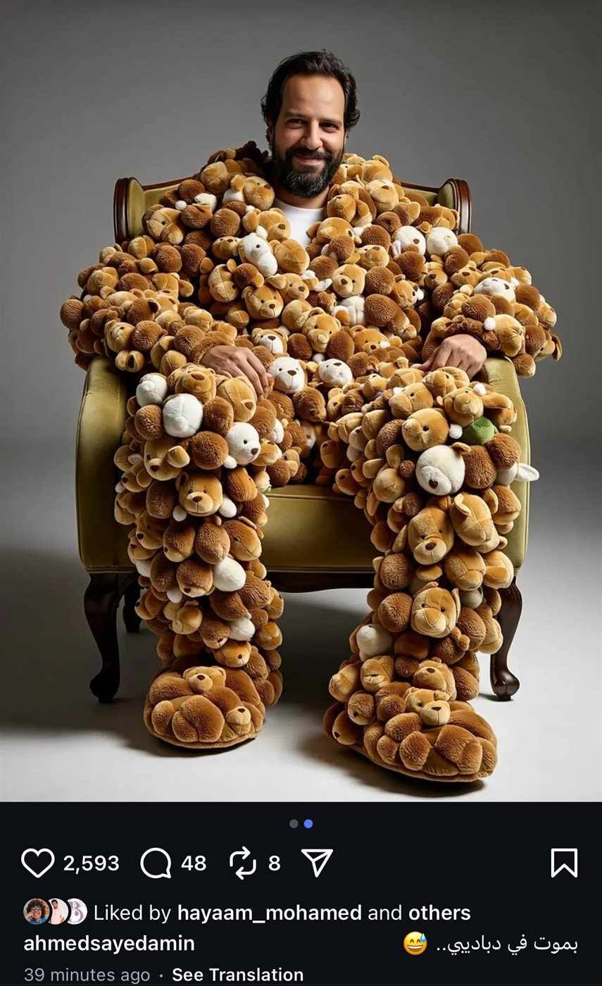 شارك الفنان أحمد أمين، متابعيه عبر مواقع التواصل الاجتماعي بصورة طريفة، استخدم فيها تقنيات الذكاء الاصطناعي ليظهر مرتديًا جمبسوت مصنوع بالكامل من "الدباديب" بدرجات البني والبيج.