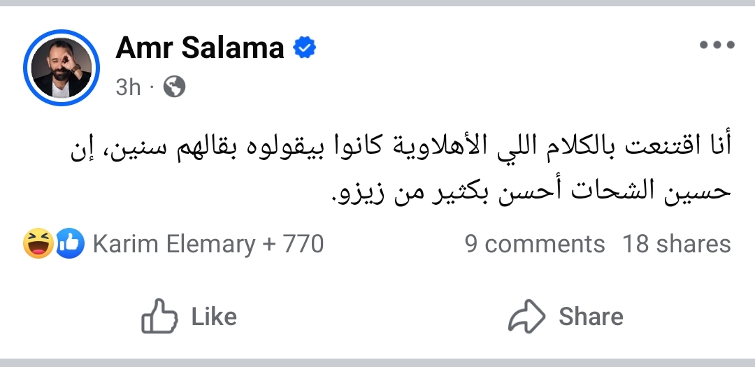 وكتب سلامة عبر صفحته على فيسبوك: "أنا اقتنعت بالكلام اللي الأهلاوية كانوا بيقولوه بقالهم سنين، إن حسين الشحات أحسن بكثير من زيزو".