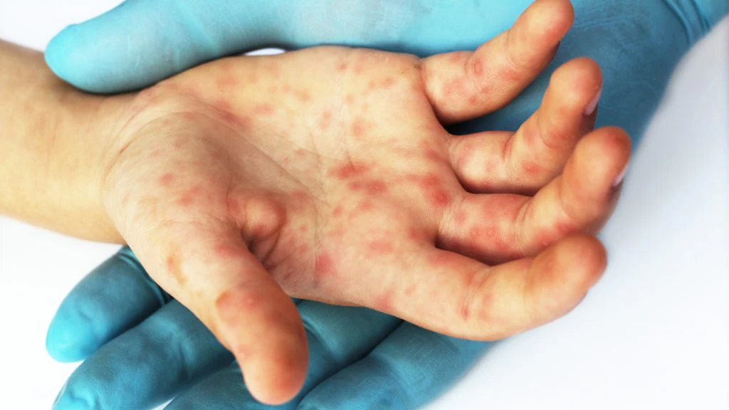 HFMD هو مرض فيروسي شائع بين الأطفال، وتشمل أعراضه: ارتفاع في درجة الحرارة، والتهاب الحلق، وتقرحات في الفم، وطفح جلدي أو بثور على اليدين أو القدمين أو الأرداف.