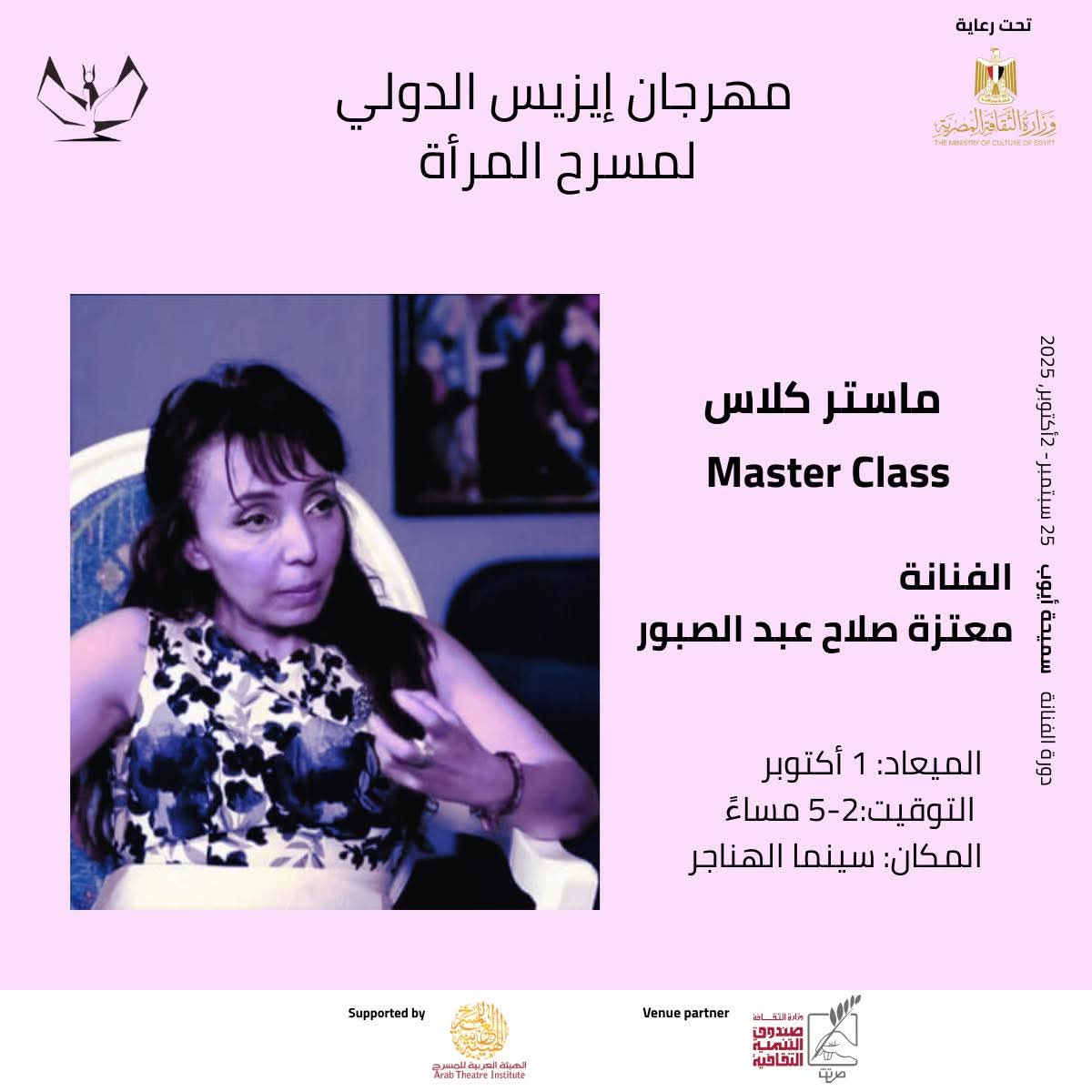 تقدم الفنانة والمخرجة معتزة صلاح عبد الصبور ماستر كلاس مميزًا حول فن التمثيل، بعنوان: "مناهج التمثيل: من القرن التاسع عشر إلى اليوم وتحديات الممثل/ة في تجسيد الشخصية الدرامية"، وذلك غدٍ الأربعاء، من الساعة 2:00 إلى 5:00 مساءً، في سينما الهناجر بدار الأوبرا المصرية، وذلك في إطار فعاليات الدورة الثالثة من مهرجان إيزيس الدولي لمسرح المرأة.
