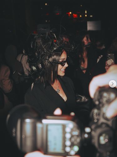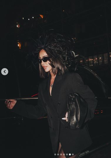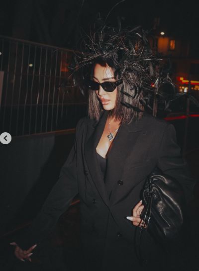واختارت ترك خصلات شعرها منسدلة بحرية فوق كتفيها بشكل ناعم وزينته ببعض الريش الناعم باللون الأسود وارتدت نظارة شمس تناغمت مع ملامحها بعدما وضعت مكياجًا ناعمًا مرتكزًا على الألوان الترابية مع تحديد عينيها بالكحل والماسكرا السوداء ولون النود في الشفاه.