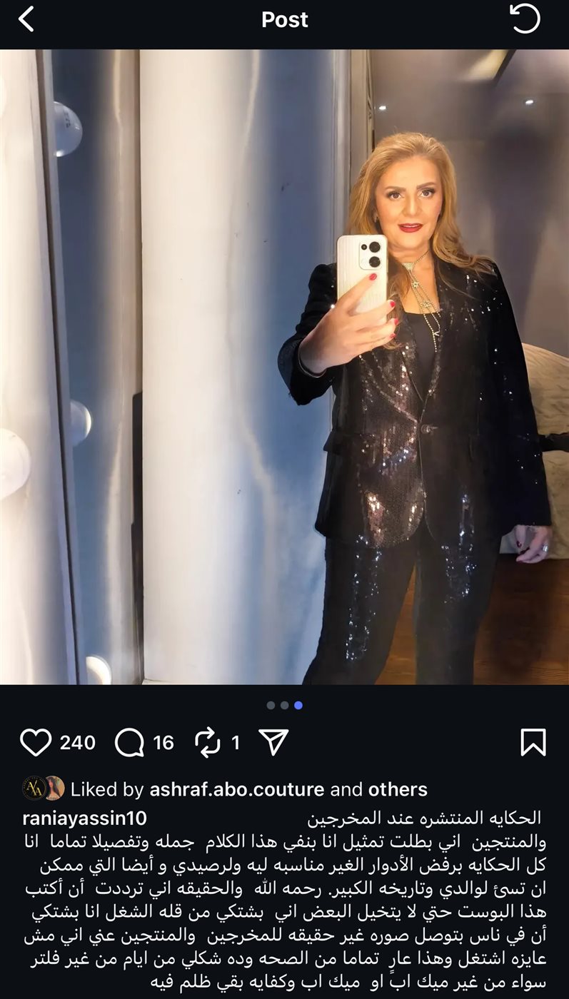 وكتبت رانيا: " الحكايه المنتشره عند المخرجين والمنتجين اني بطلت تمثيل انا بنفي هذا الكلام جمله وتفصيلا تماما انا كل الحكايه برفض الأدوار الغير مناسبه ليه ولرصيدي و أيضا التي ممكن ان تسئ لوالدي وتاريخه الكبير رحمه الله والحقيقه اني ترددت أن أكتب هذا البوست حتي لا يتخيل البعض اني بشتكي من قله الشغل انا بشتكي أن في ناس بتوصل صوره غير حقيقه للمخرجين والمنتجين عني اني مش عايزه اشتغل وهذا عار تماما من الصحه وده شكلي من ايام من غير فلتر سواء من غير ميك اب او ميك اب وكفايه بقي ظلم فيه".