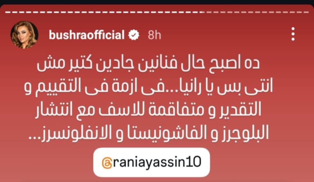 من جانبها، دعمت الفنانة بشرى موقف رانيا بتعليق على "ستوري" عبر حسابها في إنستجرام، مؤكدة أن الأزمة لا تخص رانيا وحدها، بل يعاني منها كثير من الفنانين الجادين، مشيرة إلى أن تراجع التقدير والاهتمام بأصحاب الموهبة الحقيقية تفاقم مع صعود البلوجرز والفاشونستا والإنفلونسرز في الساحة الفنية.