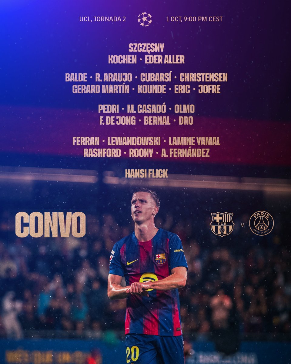 كشف هانز فليك مدرب برشلونة الإسباني، قائمة فريقه لمباراة باريس سان جيرمان الفرنسي، مساء اليوم الأربعاء، في الجولة الثانية من مرحلة الدوري من دوري أبطال أوروبا، موسم 2025/26.