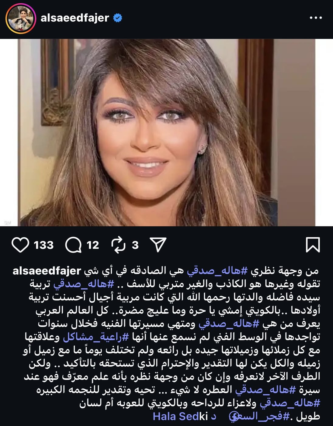 وأردفت: “ولكن الطرف الآخر لا نعرفه وإن كان من وجهة نظره بأنه علم معرّف فهو عند سيرة هالة صدقي العطره لا شيء”، مختتمة: “تحيه وتقدير للنجمه الكبيره هالة صدقي ولاعزاء للرداحه وبالكويتي للعوبه أم لسان طويل”.