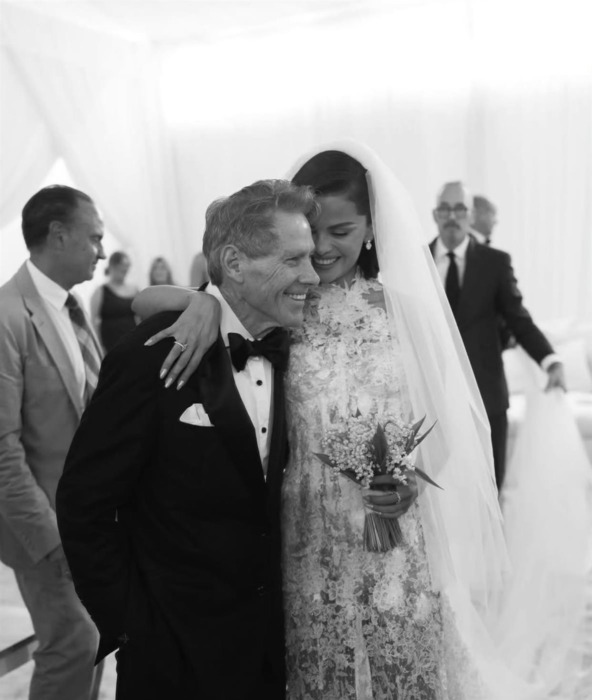 بدأت سيلينا غوميز الحفل بإطلالة ملكية ساحرة، حين ظهرت بفستان زفاف أنثوي مطرز بالكامل بالدانتيل الأبيض الفاخر، وجاء الفستان بقصة ضيقة تبرز قوامها برشاقة، مع ياقة عالية مطرزة بالدانتيل أضافت لمسة من الرقي الكلاسيكي المستوحى من أجواء القصور.