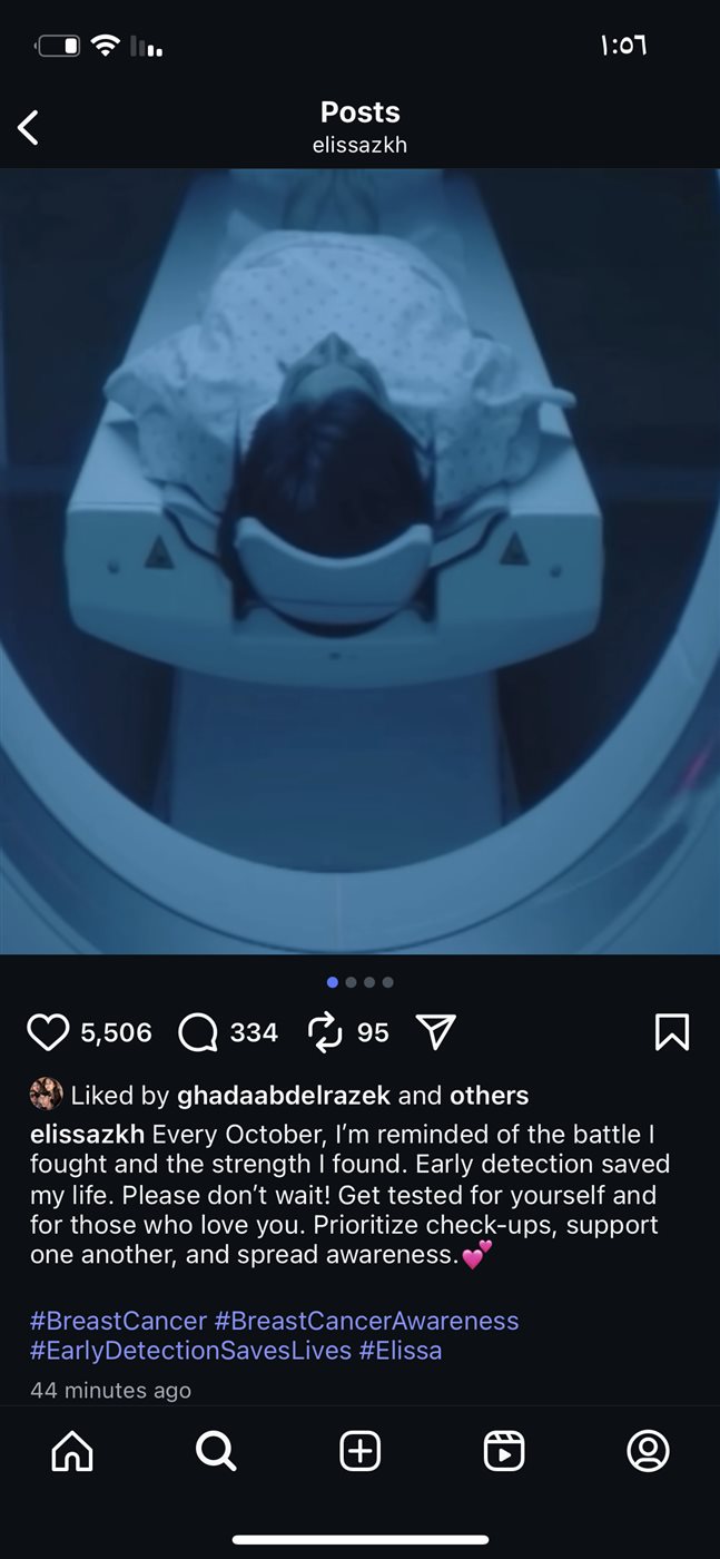 شاركت النجمة اللبنانية إليسا جمهورها عبر صفحتها الرسمية على موقع تبادل الصور والفيديوهات إنستجرام رسالة مهمة بمناسبة شهر التوعية بسرطان الثدي، مؤكدة على أهمية الاهتمام بالصحة وعدم التردد في إجراء الفحوصات اللازمة، مستعرضة تجربتها الشخصية مع المرض.