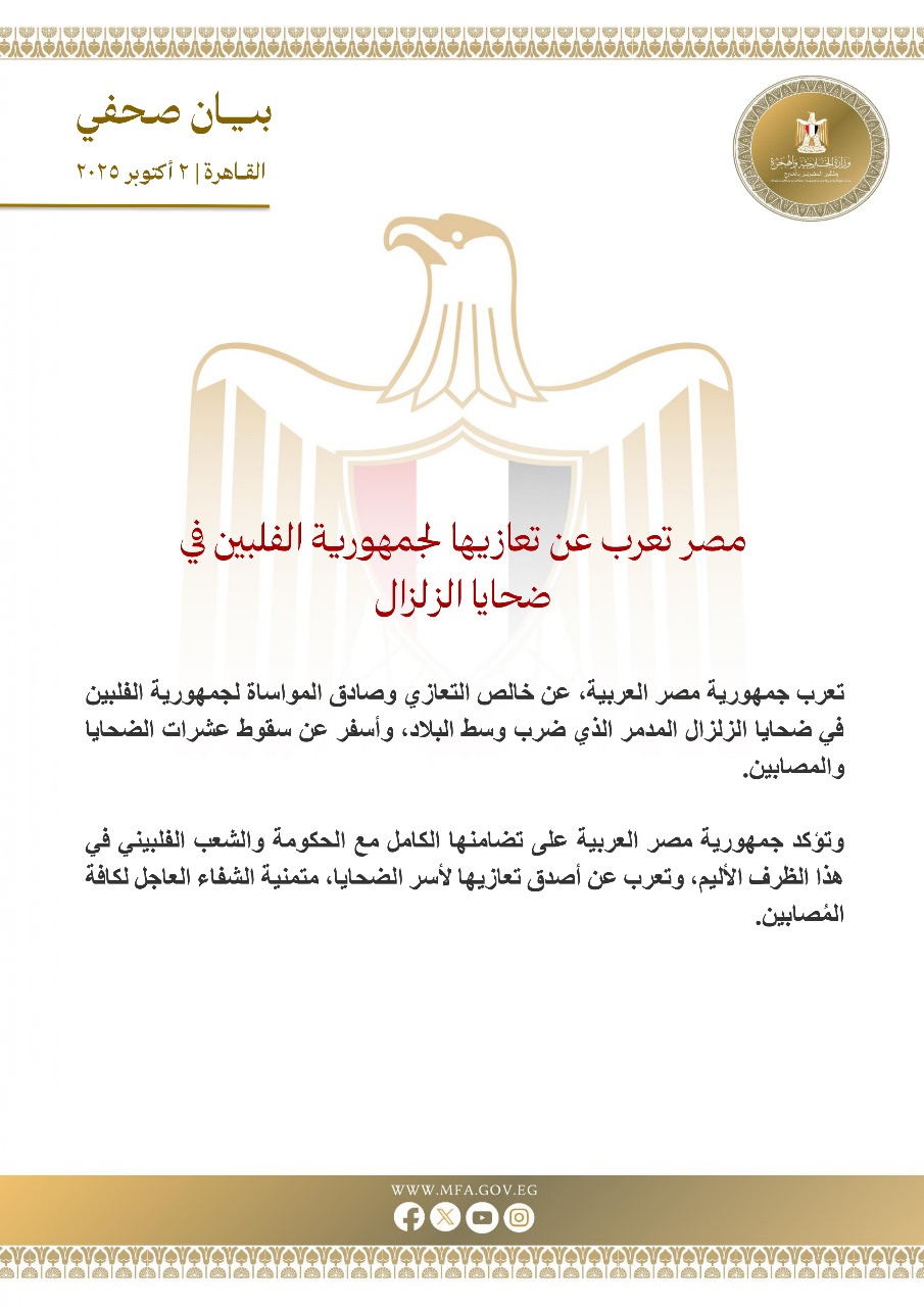 تعرب جمهورية مصر العربية، عن خالص التعازي وصادق المواساة لجمهورية الفلبين في ضحايا الزلزال المدمر الذي ضرب وسط البلاد، وأسفر عن سقوط عشرات الضحايا والمصابين.