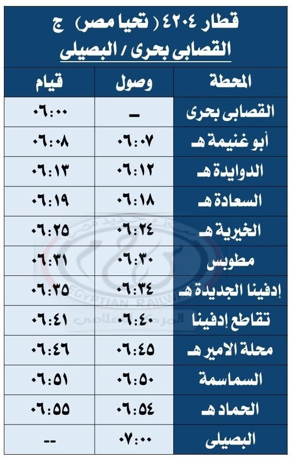 وتعديل ميعاد قيام قطار 4204 (تحيا مصر) القصابى بحرى / البصيلى ليقوم الساعة 06:00 صباحًا بدلاً من الساعة 06:15 صباحًا