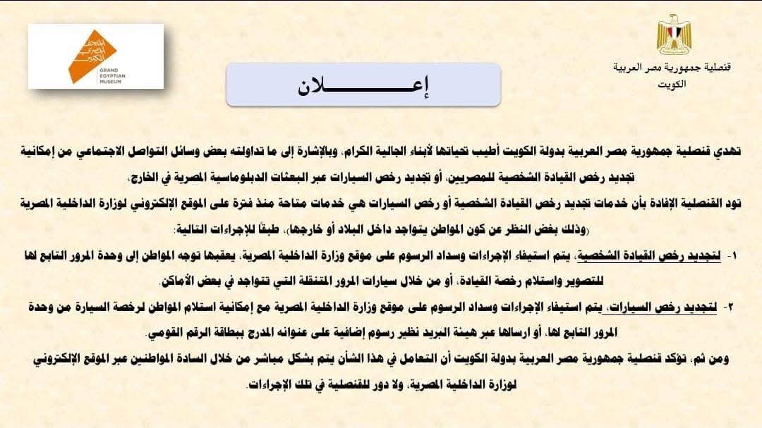 أصدرت قنصلية جمهورية مصر العربية بدولة الكويت توضيحاً رسمياً حول ما تردد على بعض وسائل التواصل الاجتماعي بشأن إمكانية تجديد رخص القيادة الشخصية أو تراخيص السيارات للمصريين عبر البعثات الدبلوماسية في الخارج.
