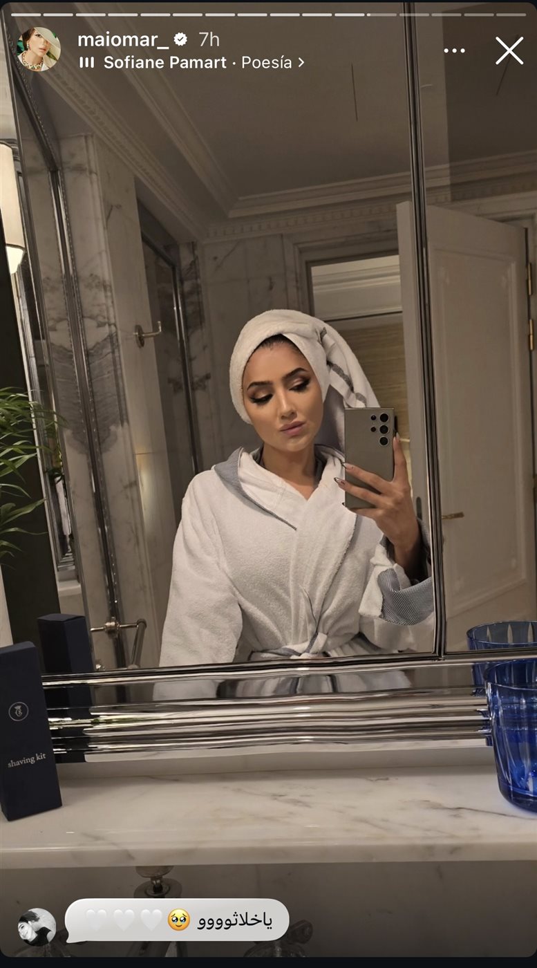 وظهرت مي عمر بإطلالة غير معتادة، حيث ارتدت روبًا باللون الأبيض منحها طابعًا غريبًا ومميزًا في الوقت نفسه.