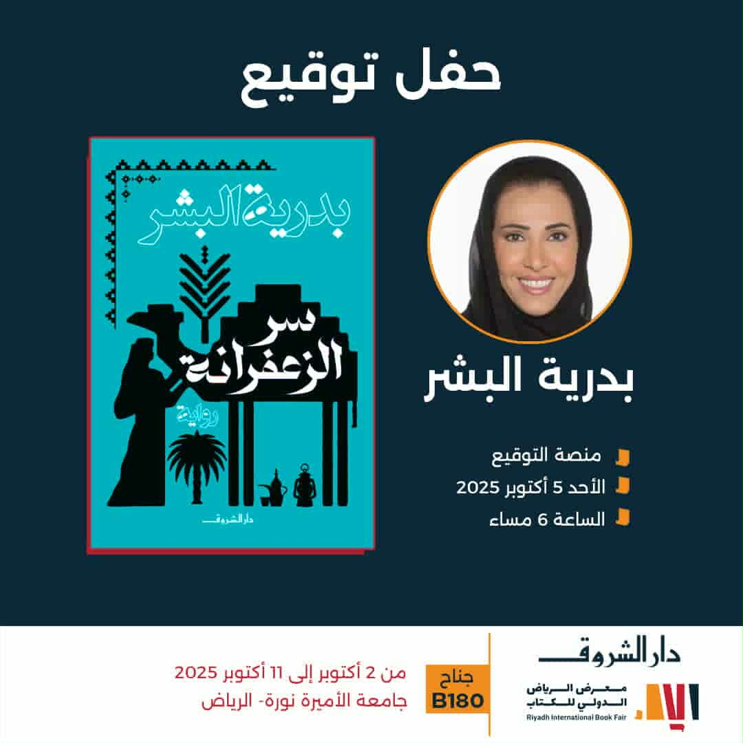 تلتقي الكاتبة والروائية السعودية بدرية البشر قرائها في فعاليات معرض الرياض للكتاب 2025، مساء غد الأحد 5 أكتوبر 2025 الساعة السادسة، خلال حفل توقيع روايتها "سر الزعفرانة"، الصادرة حديثا عن دار الشروق، وذلك بمنصة التوقيع في جامعة الأميرة نورة بالرياض.