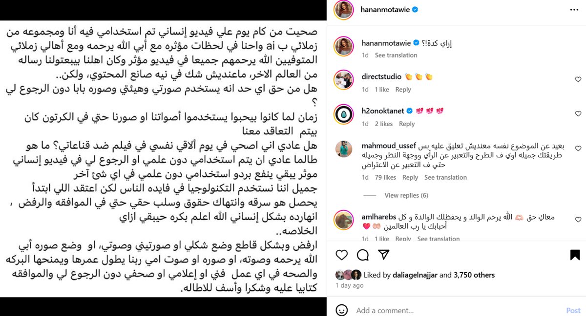 وقالت حنان مطاوع: “صحيت من كام يوم على فيديو إنساني تم استخدامي فيه أنا ومجموعة من زملائي ب ai وإحنا في لحظات مؤثرة مع أبي الله يرحمه ومع أهالي زملائي المتوفين الله يرحمهم جميعا في فيديو مؤثر، وكان أهلنا بيبعتولنا رسالة من العالم الآخر”.