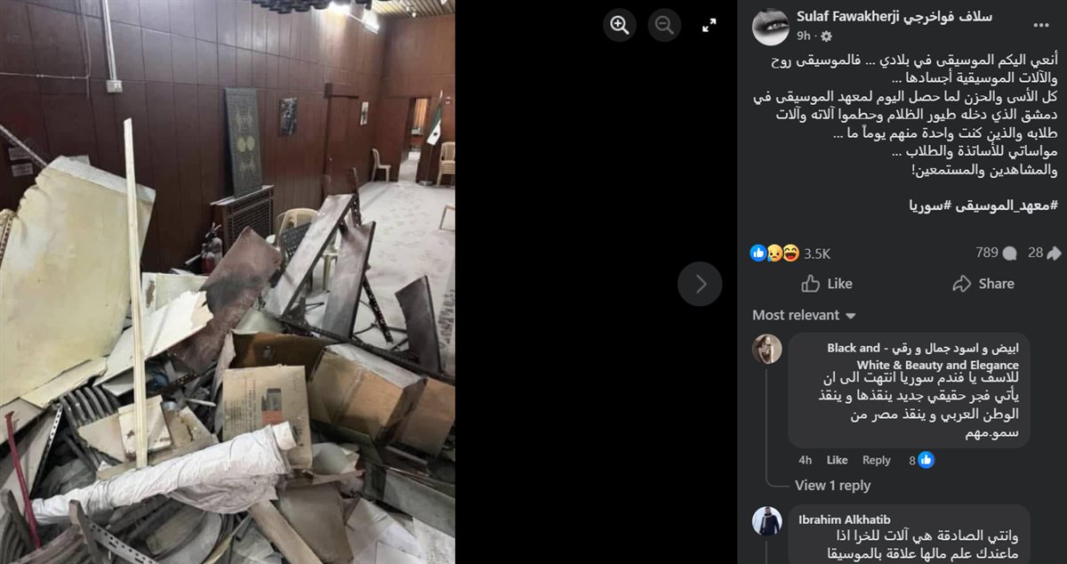 وكان عدد من رواد مواقع التواصل الاجتماعي تداولوا صورًا صادمة توثق تدمير معهد الموسيقى في سوريا دون الإشارة إلى الشخص المتسبب في وقوع ذلك.