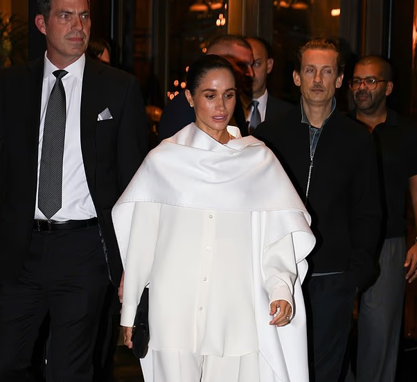 ارتدت ميجان عباءة بيضاء واسعة فوق قميص أبيض بأزرار وبنطال أنيق من نفس اللون.