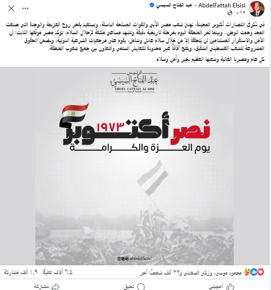 وقال الرئيس السيسى - عبر حساباته الرسمية بمواقع التواصل الاجتماعي: "في ذكرى انتصارات أكتوبر المجيدة، نهنئ شعب مصر الأبي والقوات المسلحة الباسلة، ونستعيد بفخر روح العزيمة والوحدة التي صنعت المجد وحمت الوطن.. وبينما تمر المنطقة اليوم بمرحلة تاريخية دقيقة وتشهد مساعي مكثفة لإحلال السلام، تؤكد مصر موقفها الثابت: إن الأمن والاستقرار المستدامين لن يتحققا إلا من خلال سلام عادل وشامل، يقوم على مرجعيات الشرعية الدولية، ويضمن الحقوق المشروعة للشعب الفلسطيني الشقيق، ويفتح آفاقاً غير محدودة للتعايش السلمي والتعاون بين جميع شعوب المنطقة.. كل عام ومصرنا الغالية وشعبها العظيم بخير وأمن وسلام".