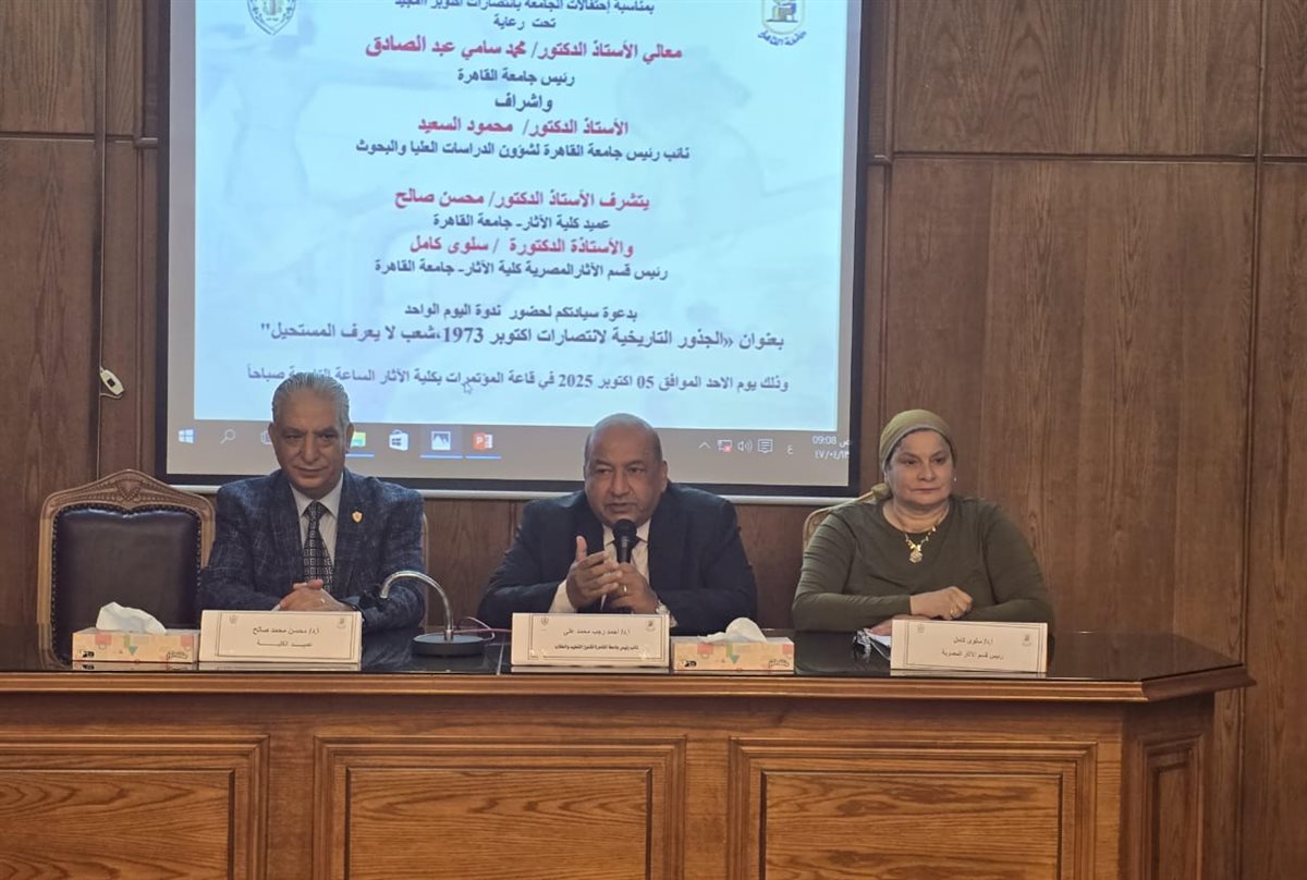نظم قسم الآثار المصرية القديمة بكلية الآثار جامعة القاهرة، ندوة بعنوان "الجذور التاريخية لانتصارات أكتوبر 1973.. شعب لا يعرف المستحيل"، وذلك احتفالًا بذكرى انتصارات أكتوبر المجيدة، تحت رعاية الدكتور محمد سامي عبدالصادق، رئيس الجامعة، والدكتور محمود السعيد، نائب رئيس الجامعة لشئون الدراسات العليا والبحوث، وإشراف الدكتور محسن صالح، عميد كلية الآثار، والدكتورة سلوى كامل، رئيس قسم الآثار المصرية.