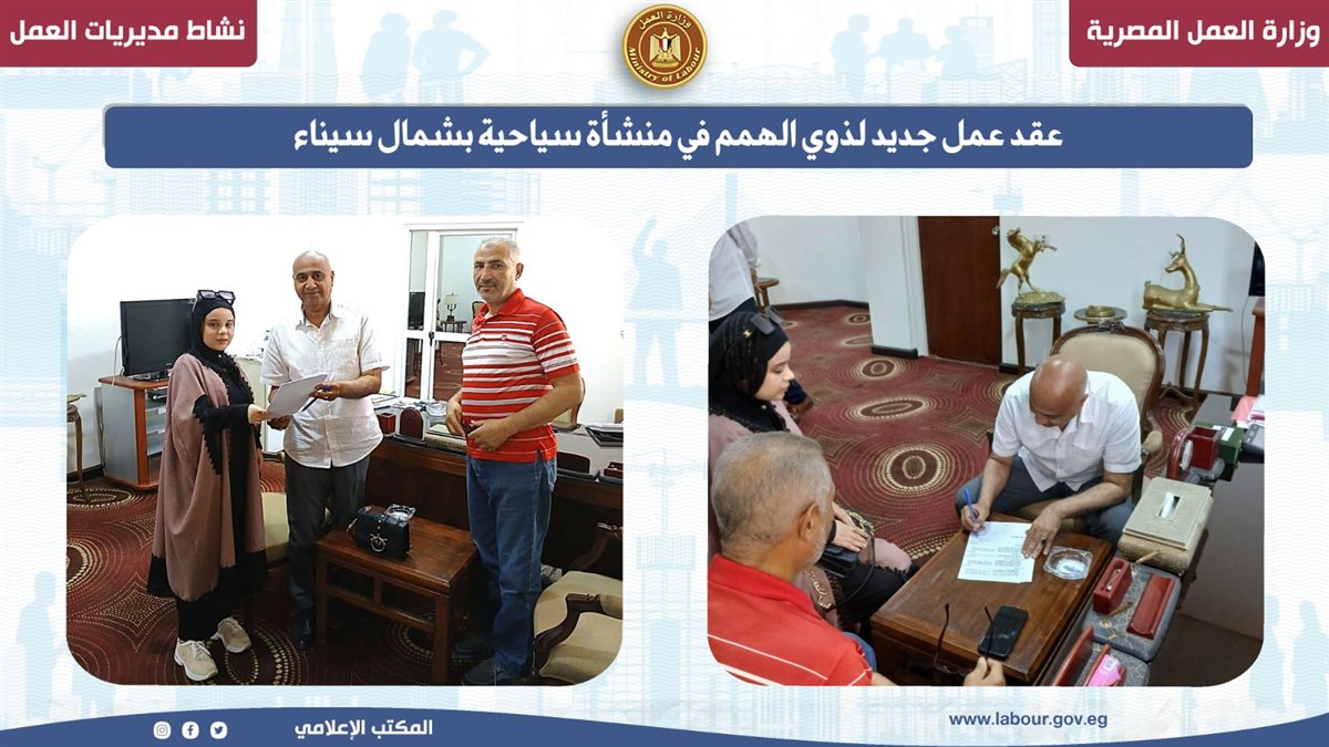 كما سلمت مديرية العمل بشمال سيناء، عقد عمل جديد لأحد الشباب من ذوي الهمم للعمل بأحد الفنادق السياحية بمدينة العريش، وذلك في إطار جهود توفير فرص عمل مناسبة لهم في منشآت القطاع الخاص، وتنفيذاً لتوجيهات وزير العمل محمد جبران، بشأن دعم ذوي الهمم ودمجهم في سوق العمل.
