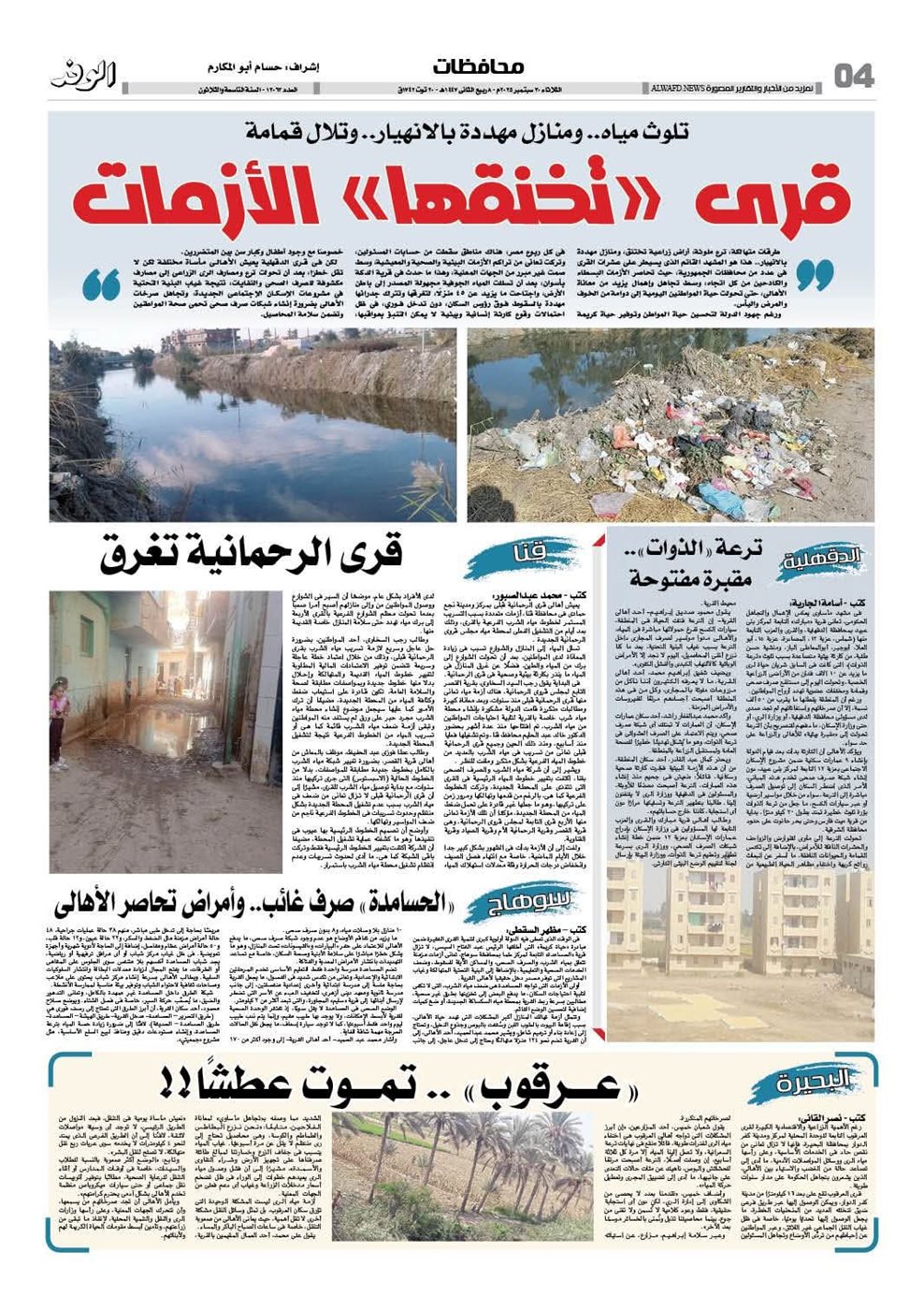 وذلك عقب تكرار حوادث انفجار بعض خطوط مياه الشرب الرئيسية والفرعية فى الاونة الأخيرة بعدد من قرى الرحمانية، وذلك بعد تشغيل محطة المرشحات الجديدة بقروى الرحمانية، والتى تبنتها الوفد ونشرتها فى عددها الورقى وبوابتها الإلكترونية
