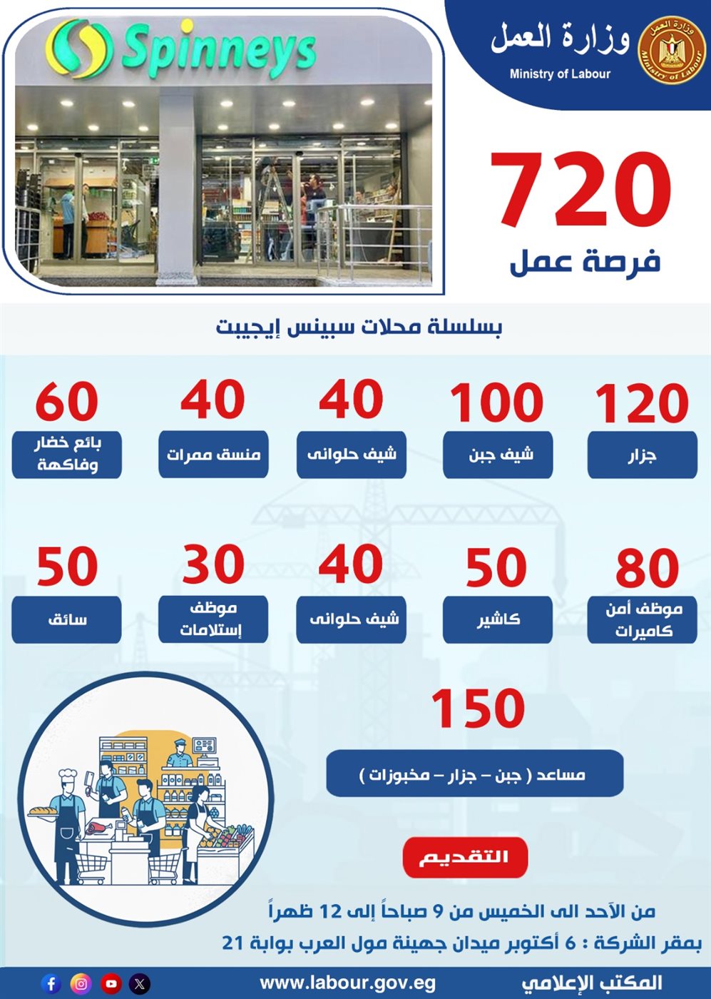 أعلنت وزارة العمل، اليوم، عن توفير 720 فرصة عمل جديدة، بالتعاون مع سلسلة محلات سبينس إيجيبت، وذلك في إطار جهود الوزارة المستمرة لفتح مجالات جديدة للتشغيل وتوفير فرص عمل لائقة للشباب، بالتنسيق بين الإدارة العامة للتشغيل بالوزارة ومديرية عمل الجيزة.