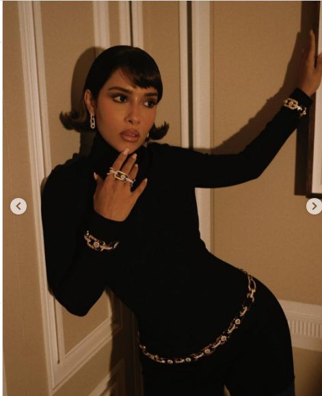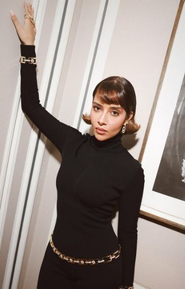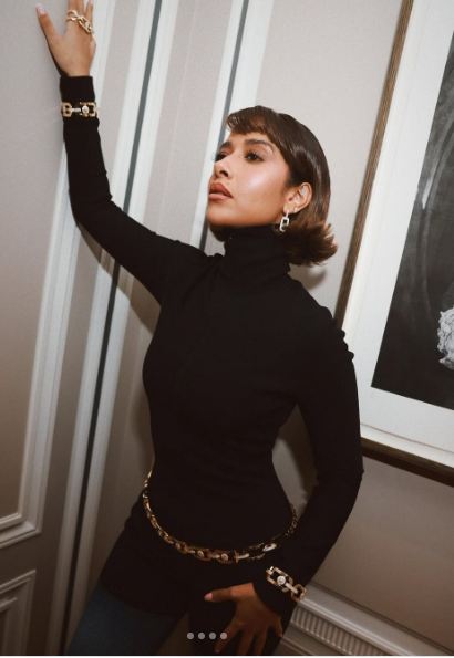 ولعبت الإكسسوارات الذهبية دورًا رئيسيًا في إضافة لمسة ناعمة على إطلالتها.