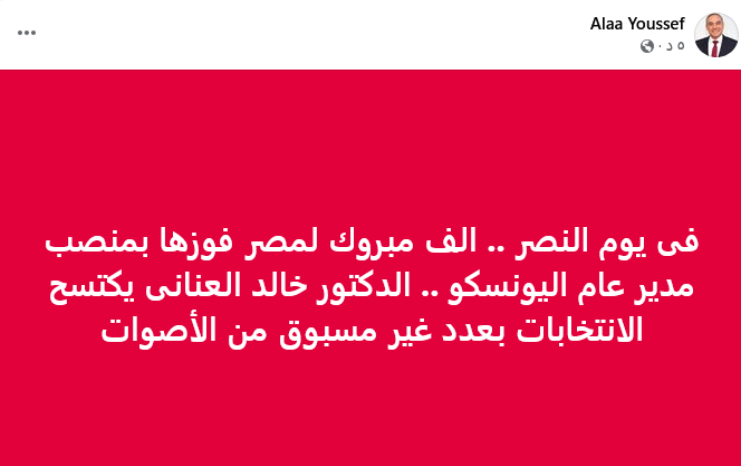 وكتب علاء يوسف، عبر حسابه الرسمي على موقع "فيسبوك"، اليوم : "فى يوم النصر.. ألف مبروك لمصر فوزها بمنصب مدير عام اليونسكو.