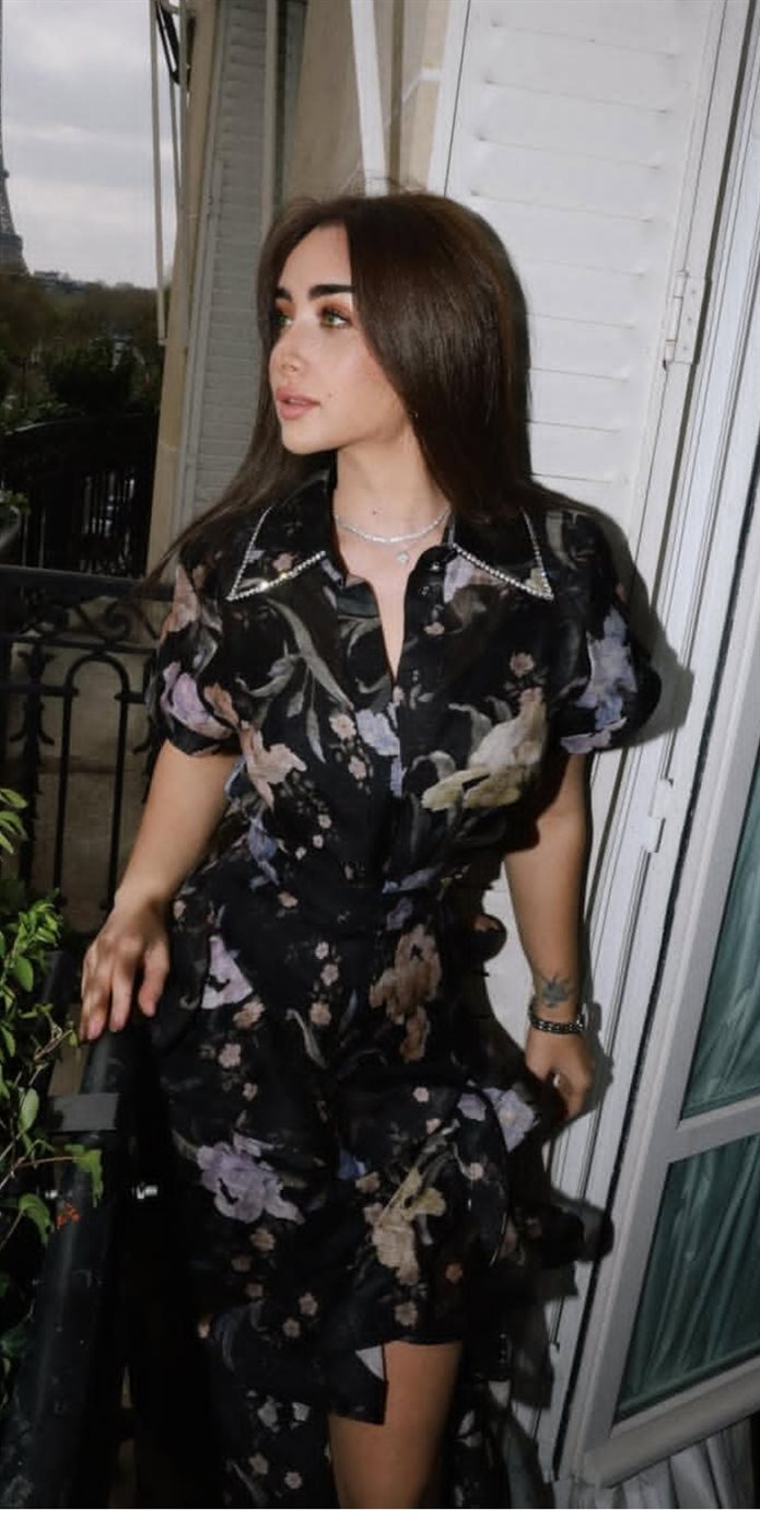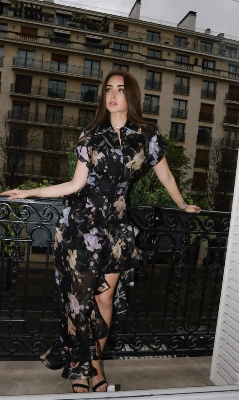 وبدت هنا الزاهد بإطلالة صيفية مفعمة الأنوثة والرقي في آن واحد، مرتدية فستان قصير من جانب وطويل من جانب آخر، صمم الفستان من قماش الحرير ذا ارضية سوادء مزركشه بالزهور البنية، لتبدو مثل الزهرة في البستان و تظل مثال تقتدي به صاحبات الذوق الرفيع.
