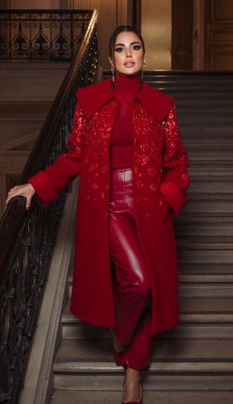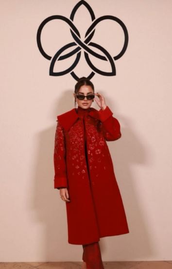 وبدت درة بإطلالة ساحرة مفعمة بالاناقة والاحتشام في آن واحد، شتوية موحّدة باللون الأحمر، عبارة عن هاي كول خريفي بقبة عالية، مع بنطلون بتصميم كلاسيكي من الجلد الأحمر، ونسقتهما مع بالطو طويل ذي قبة عريضة وأكمام واسعة، وتميز بالأحجار الحمراء المتلألئة التي تم توزيعها على القسم الأعلى من المعطف وأكمامه، سيطرة اللون الأحمر على إطلالتها جعلها تشبه زهرة الحب في أسبوع الموضة بباريس.