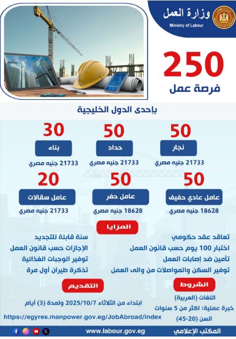 أعلن وزير العمل محمد جبران، اليوم، عن فتح باب التقديم لـ 250 فرصة عمل جديدة للعمالة المصرية بإحدى الدول الخليجية، في عدد من المهن الفنية، تشمل: (50 نجار – 50 حداد – 30 بناء – 20 عامل سقالات – 50 عامل حفر – 50 عامل عادي خفيف)، برواتب تتراوح  ما بين ما يعادل  18 ألف و628 جنيهًا مصريا إلى 21 ألف و733 جنيهًا مصريًا شهريًا.