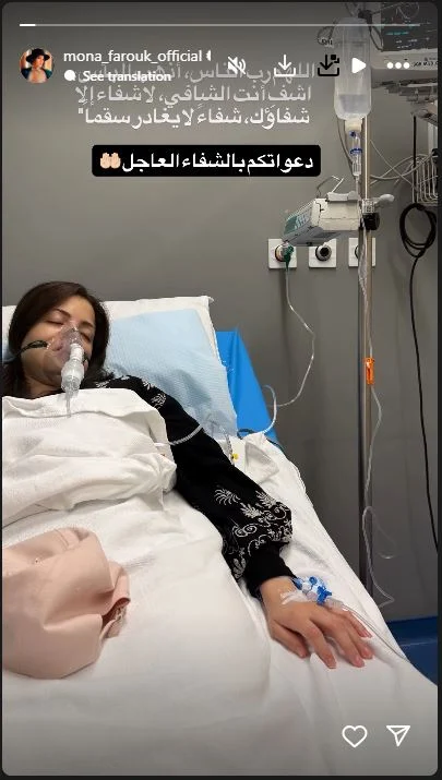 نشرت منى فاروق صورتها من داخل المستشفى، وهي على فراش المرض تتلقى الرعاية الطبية، وأرفقتها بتعليق قائلة: "اللهم رب الناس أذهب البأس، اشفِ أنت الشافي، لا شفاء إلا شفاؤك، شفاء لا يغادر سقماً.. دعواتكم بالشفاء العاجل"، مطالبة الجمهور بالدعاء لها لتخطى أزمتها الصحية.