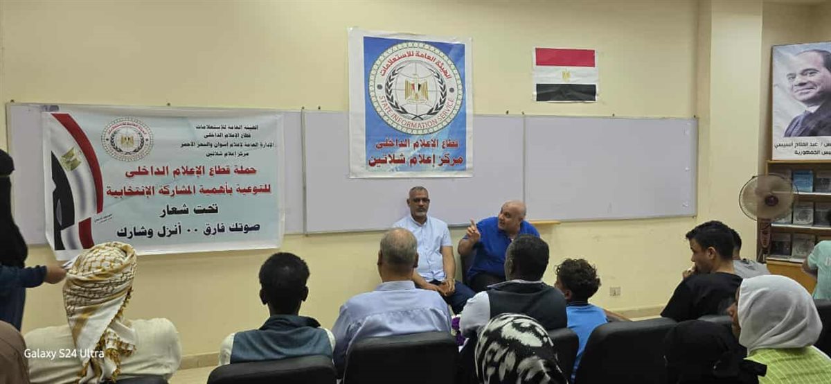 نظم مجمع إعلام شلاتين ندوة تثقيفية بعنوان "وقتك تتكلم.. وقتك تشارك"، استهدفت عددًا من القيادات الشبابية بمدينة شلاتين، وذلك ضمن فعاليات حملة قطاع الإعلام الداخلي للتوعية بأهمية المشاركة الانتخابية، وتشجيع الشباب على ممارسة حقوقهم السياسية بإيجابية ووعي.