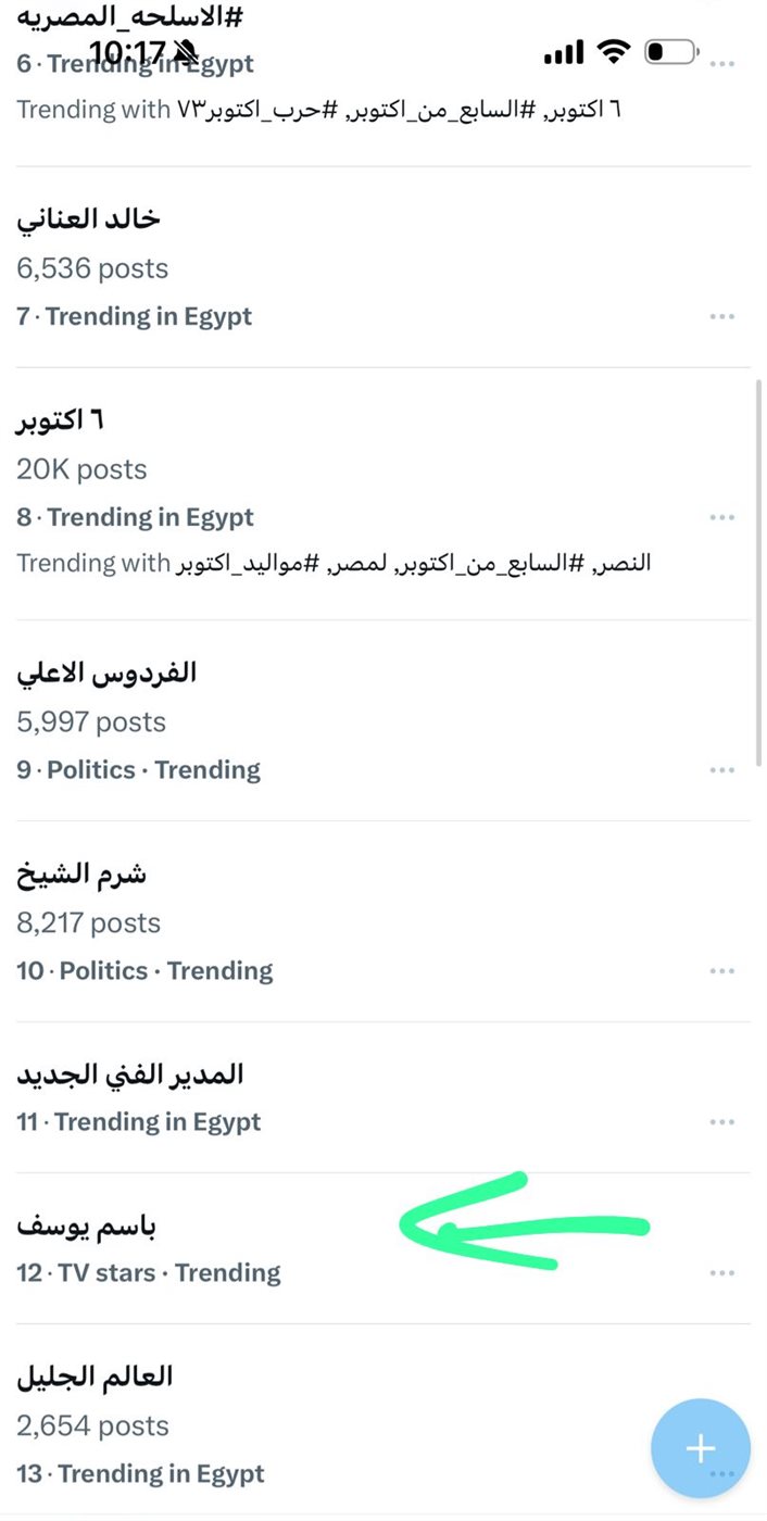تصدر هاشتاج باسم يوسف قائمة الأكثر تداولا عبر منصة التغريدات المصغرة “إكس”، وذلك عقب ظهوره مع الإعلامى أحمد سالم في برنامج كلمة أخيرة على شاشة "ON".