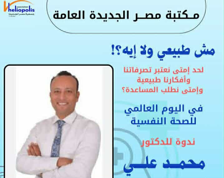 تنظم مكتبة مصر الجديدة العامة، يوم الجمعة المقبل، ندوة علمية بعنوان "الصحة النفسية وآثارها على الصحة العامة"، والتي تأتي متزامنة مع اليوم العالمي للصحة النفسية ضمن سلسلة من اللقاءات التي تهم كافة أطياف المجتمع، وذلك في تمام الساعة الخامسة مساءً، برعاية الدكتورة سهام الجوهري، رئيس مجلس إدارة جمعية مصر الجديدة وأعضاء المجلس.