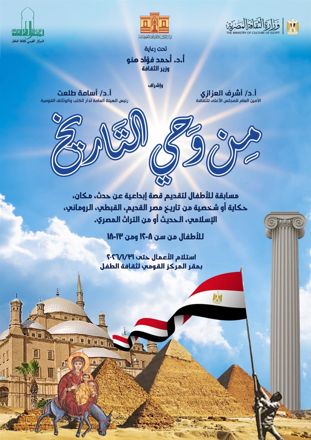 في إطار تكامل الجهود الثقافية التي تقدم للأجيال الناشئة بناءً على توجيهات الأستاذ الدكتور أحمد فؤاد هنو وزير الثقافة، وتأكيدًا على توجيهات الدولة المصرية برعاية المبدع الصغير، بالشراكة بين مركز توثيق وبحوث أدب الطفل بالهيئة العامة لدار الكتب والوثائق القومية برئاسة الأستاذ الدكتور أسامة طلعت، والمركز القومي لثقافة الطفل بالمجلس الأعلى للثقافة بأمانة الأستاذ الدكتور أشرف العزازي، تنطلق الدورة الأولى من المسابقة الأدبية للأطفال المصريين بعنوان: "من وحي التاريخ"، وذلك ضمن احتفاء وزارة الثقافة بذكرى نصر أكتوبر المجيد.