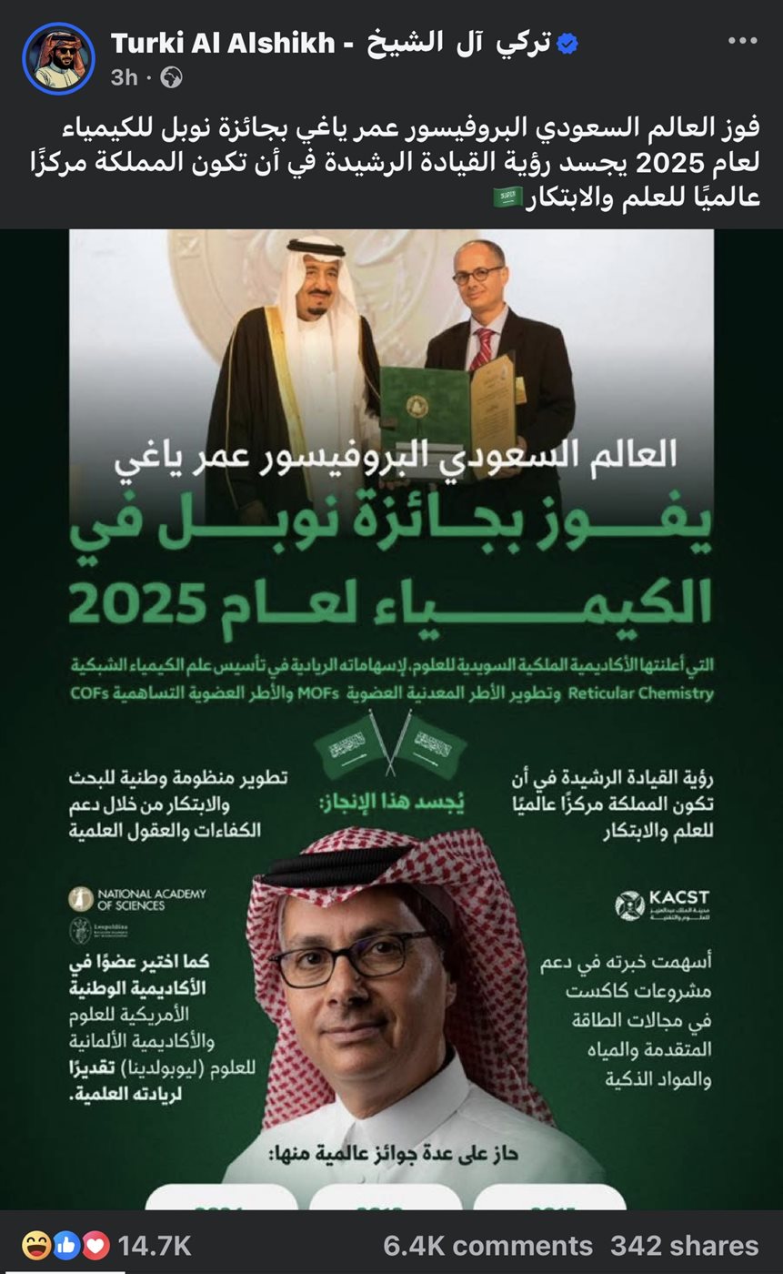 وكتب تركي آل الشيخ: “فوز العالم السعودي البروفيسور عمر ياغي بجائزة نوبل للكيمياء لعام 2025 يجسد رؤية القيادة الرشيدة في أن تكون المملكة مركزًا عالميًا للعلم والابتكار”.