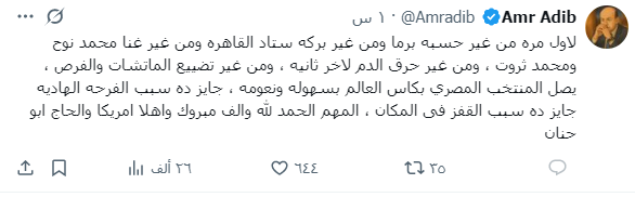 وكتب عمرو أديب على حسابة بموقع التواصل الاجتناعي “إكس” : “لأول مره من غير حسبه برما ومن غير بركه ستاد القاهره ومن غير غنا محمد نوح ومحمد ثروت ، ومن غير حرق الدم لاخر ثانيه ، ومن غير تضييع الماتشات والفرص ، يصل المنتخب المصري بكاس العالم بسهوله ونعومه”