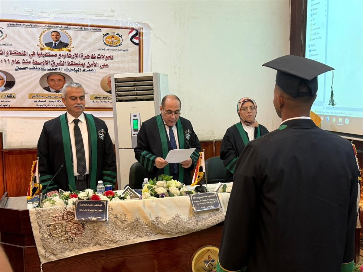 وقد أشادت لجنة المناقشة بجهود الباحث وأهمية موضوع الرسالة، وما تضمنته من تحليل علمي رصين يعكس وعيًا استراتيجيًا متقدمًا بقضايا الأمن القومي ومكافحة الإرهاب.