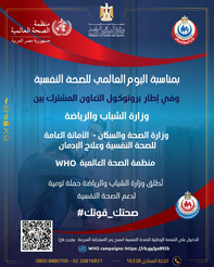 في إطار حملة "صحتك قوتك" التي تنفذها وزارة الشباب والرياضة لرفع الوعي الصحي والطبي لدى المواطنين في مختلف الفئات العمرية، تُطلق الوزارة حملة وطنية متكاملة لدعم الصحة النفسية،تحت شعار: “لا صحة بدون الصحة النفسية”، وذلك بمناسبة اليوم العالمي للصحة النفسية الذي يوافق العاشر من أكتوبر من كل عام، وفي إطار بروتوكول التعاون المشترك بينن وزارة الشباب والرياضة، وزارة الصحة والسكان (الأمانة العامة للصحة النفسية وعلاج الإدمان)، منظمة الصحة العالمية (WHO).