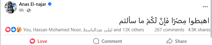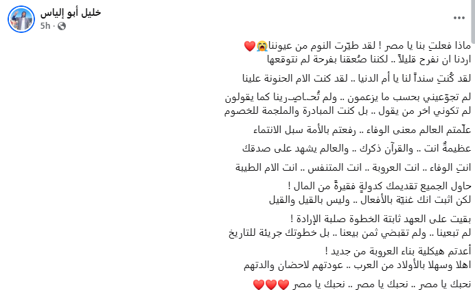وعلى ذات المنوال، قال خليل إلياس الذي كتب من قلب غزة منشوراً يفيض وداً وحباً لمصر، وكان أبرز عباراته :" عظيمةٌ انت .. والقرآن ذكرك .. والعالم يشهد على صدقك