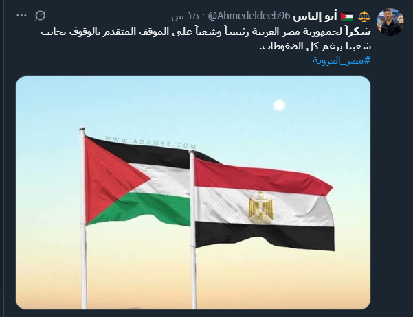 وكتب أحد المواطنين الفلسطينيين عبر حسابه على تويتر :" شكراً لجمهورية مصر العربية رئيساً وشعباً على الموقف المتقدم بالوقوف بجانب شعبنا برغم كل الضغوطات".