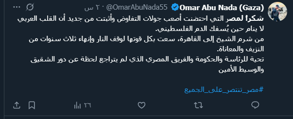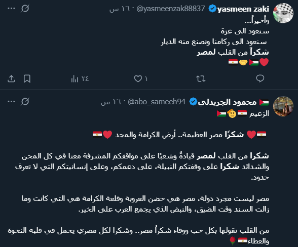 وقال عمر أبو ندى من غزة :"شكراً لمصر التي احتضنت أصعب جولات التفاوض وأثبتت من جديد أن القلب العربي لا ينام حين يُسفك الدم الفلسطيني. من شرم الشيخ إلى القاهرة، سعت بكل قوتها لوقف النار وإنهاء ثلاث سنوات من النزيف والمعاناة. تحية للرئاسة والحكومة والفريق المصري الذي لم يتراجع لحظة عن دور الشقيق والوسيط الأمين".