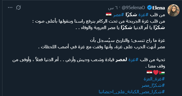 وكتبت إلينا من قلب غزة :"شكرًا يا أم الدنيا شكرًا يا مصر العروبة والوفاء . .غزة ما راح تنسى؛ والتاريخ سيُسجل بأن مصر أنهت الحرب على غزة، وأنها وقفت مع غزة في أصعب اللحظات" .